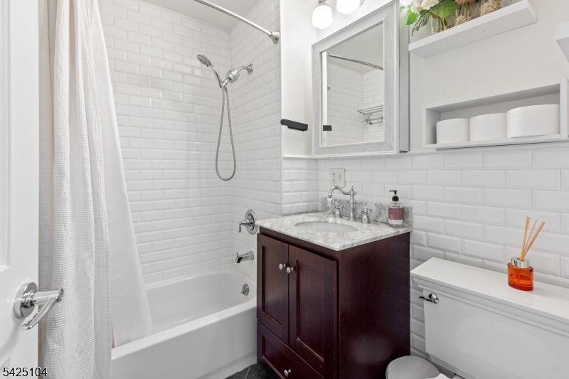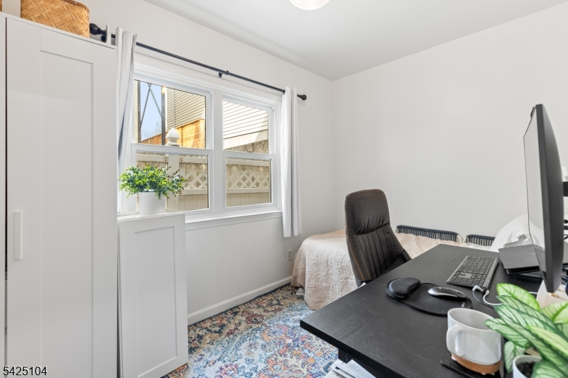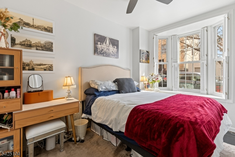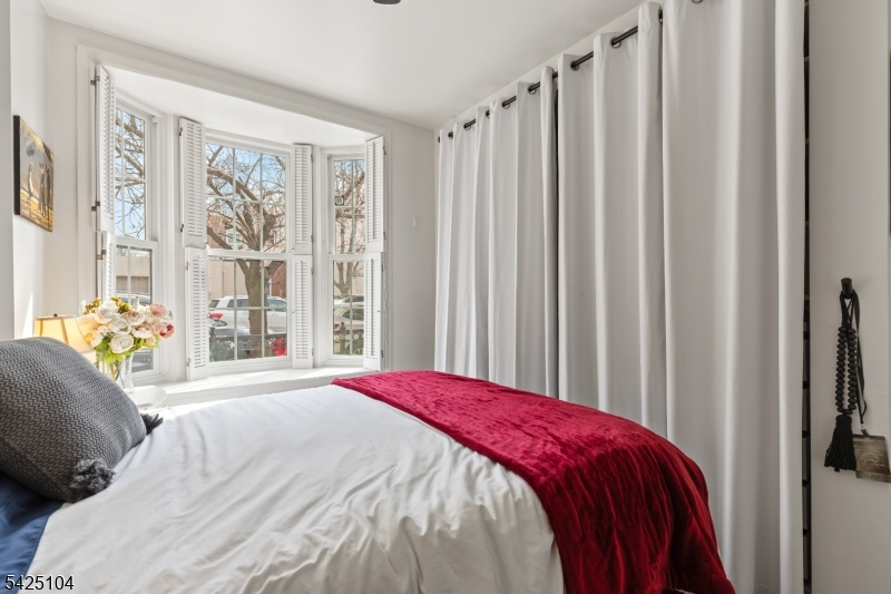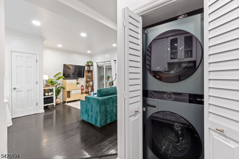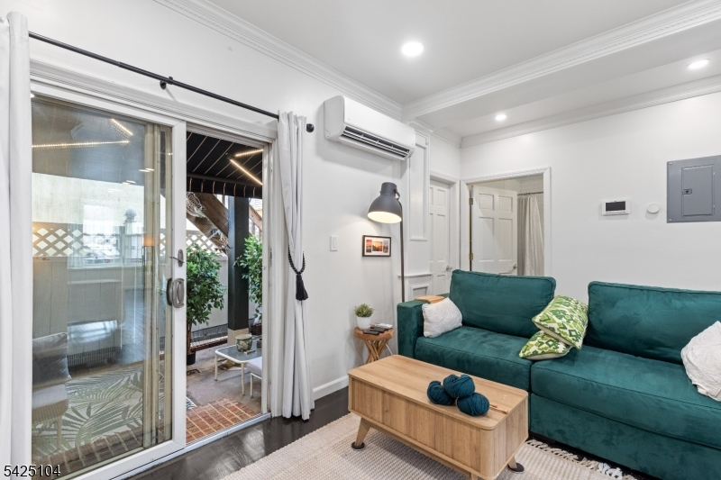 Private patio living in the sought-after Hamilton Park area of Downtown Jersey City, this beautifully renovated two-bedroom home combines modern upgrades, classic architectural charm, and an exceptional location just moments from all Jersey City offers. Situated on the first floor of a well-maintained boutique three-unit pet-friendly building, this thoughtfully designed residence offers approximately 851 sqft of comfortable living space along with a private covered patio featuring a retractable awning and lighting - perfect for outdoor dining, entertaining, or relaxing. The designer-renovated kitchen showcases quartz countertops, white shaker-style cabinetry, subway tile backsplash, under-cabinet lighting, stainless steel appliances, and striking black hex tile flooring.A brand-new in-home washer and dryer adds everyday convenience. The bright living and dining areas feature bay windows, crown molding, recessed LED lighting, and dark-stained hardwood floors. Both bedrooms are well-proportioned, with the primary bedroom offering a custom closet system. The second bedroom works perfectly as a guest room or work-from-home office.The bathroom has been tastefully updated with classic white subway tile and a Carrara marble-top vanity. Additional highlights include efficient mini-split heating and cooling, ceiling fans, and a large under-stair storage closet. For added buyer confidence, the seller will provide a one-year home warranty through Assurant at closing. Welcome Home!